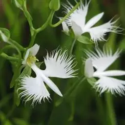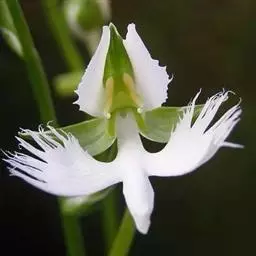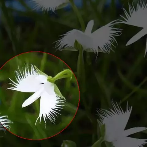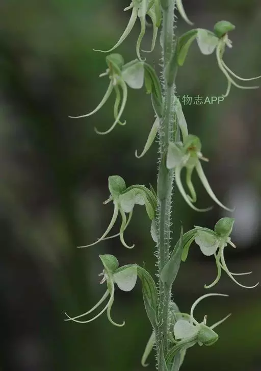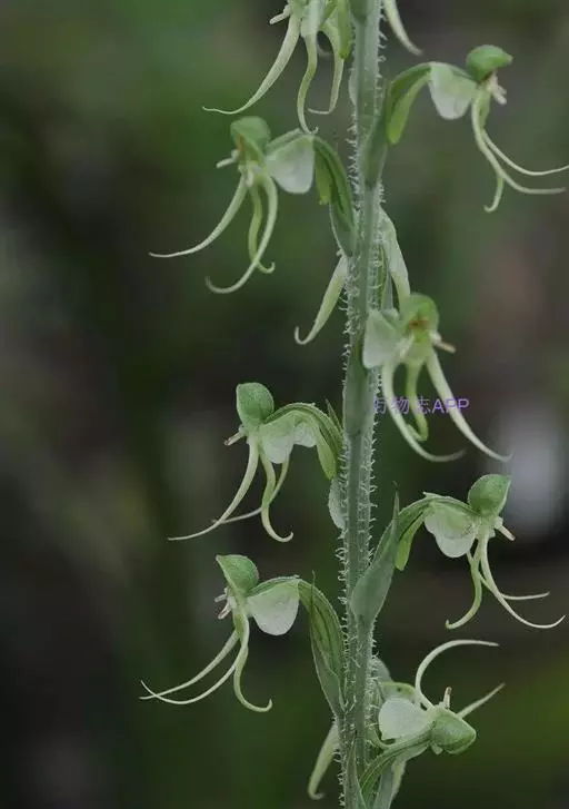 植株高25-60厘米。块茎肉质,长椭圆形或长圆形,长3-5厘米,直径1.5-2.5厘米。茎粗,直立,圆柱形,近中部具5-6枚叶,向上有5-10枚疏生的苞片状小叶。叶片椭圆状披针形、倒卵状匙形或长椭圆形,长5-16厘米,宽2-5厘米,先端渐尖或急尖,基部收狭抱茎。总状花序具6-15朵花,长9-23厘米,花葶具棱,棱上具长柔毛;花苞片卵形,长13-15毫米,先端渐尖,边缘具缘毛,较子房短;子房圆柱状纺锤形,扭转,具棱,棱上有细齿,连花梗长23-25毫米,先端弯曲,具喙;花白色或绿白色,罕带粉色,中等大;中萼片宽卵形,凹陷,兜状,长6-9毫米,宽5.5-8毫米,先端急尖或稍钝,近顶部边缘具睫毛,具5脉,背面具3条片状具细齿或近全缘的龙骨状突起,与花瓣靠合呈兜状;侧萼片反折,强烈偏斜,卵形,长6.5-10毫米,宽4-7毫米,具3-4条弯曲的脉,前部边缘臌出,宽圆形,先端急尖;花瓣直立,斜披针形,不裂,长6-7毫米,基部宽2-3毫米,先端渐尖或长渐尖,具1脉,外侧增厚;唇瓣较萼片长,基部3深裂,裂片极狭窄,丝状,并行,向上弯曲,中裂片长16-18毫米,下垂,基部无胼胝体;侧裂片长20-22毫米;距圆筒状棒形,长21-27毫米,向末端逐渐或突然膨大,下垂,中部明显向前弯曲或前部稍弯曲,稍长于或短于子房,末端钝;药室基部伸长的沟与蕊喙臂伸长的沟两者靠合成细的管,管前伸,长约2毫米,稍向上弯;柱头2个,隆起,长圆形,长约1.5毫米。花期7-9月。