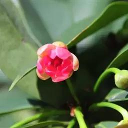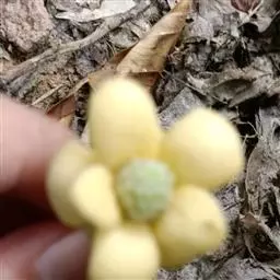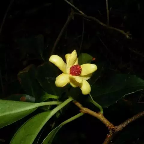 花单生于叶腋,雌雄异株,花被片白色或浅黄色,11-15片,外轮和内轮的较小,中轮的最大1片,椭圆形至倒卵形,长8-16毫米,宽5-12毫米;雄花:花托椭圆体形,顶端伸长圆柱状,圆锥状凸出于雄蕊群外;雄蕊群椭圆体形,长6-7毫米,径约5毫米,具雄蕊50-65枚;雄蕊长0.8-1.8毫米;花丝与药隔连成近宽扁四方形,药隔顶端横长圆形,药室约与雄蕊等长,花丝极短;花梗长3-20毫米,具数枚小苞片。雌花:雌蕊群近球形,径6-8毫米,具雌蕊30-55枚,子房长圆状倒卵圆形,花柱顶端具盾状的柱头冠;花梗3-30毫米。