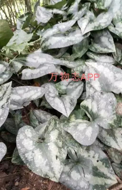 多年生草本;根状茎短,根丛生,稍肉质,直径1-2毫米。叶片阔心形至肾心形,长和宽各为3-8厘米,先端钝或圆,基部心形,两侧裂片长1-3厘米,宽1.5-3.5厘米,叶面深绿色,中脉两旁有白色云斑,脉上及其近边缘有短毛,叶背浅绿色;叶柄长3-15厘米;芽苞叶肾心形或倒卵形,长和宽各约1厘米,边缘有睫毛。
