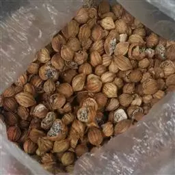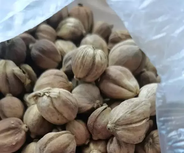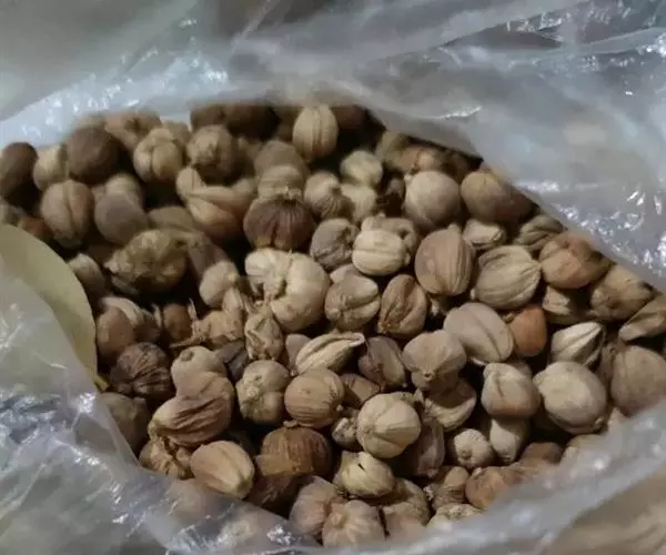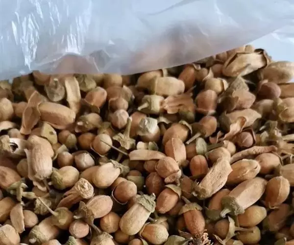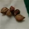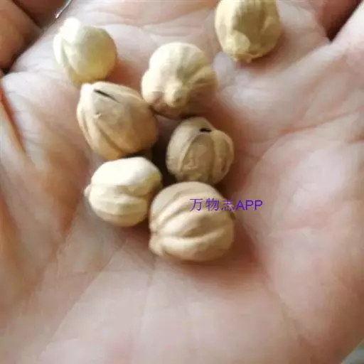 蒴果近球形,直径约16毫米,白色或淡黄色,略具钝三棱,有7-9条浅槽及若干略隆起的纵线条,顶端及基部有黄色粗毛,果皮木质,易开裂为三瓣;种子为不规则的多面体,直径约3-4毫米,暗棕色,种沟浅,有芳香味。花期:5月;果期:6-8月。