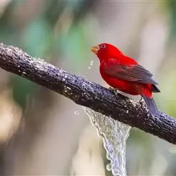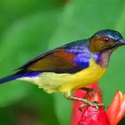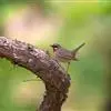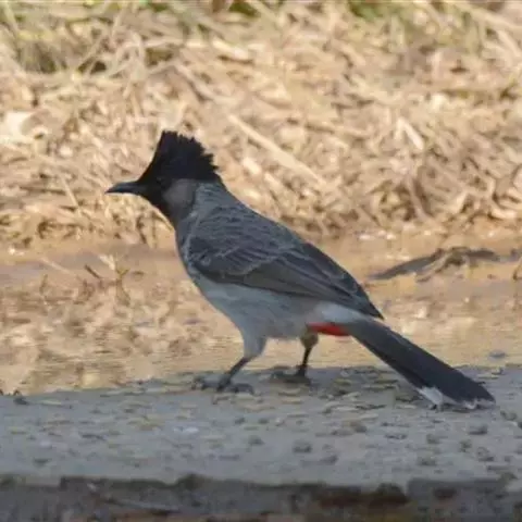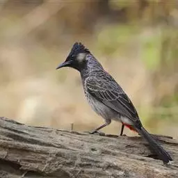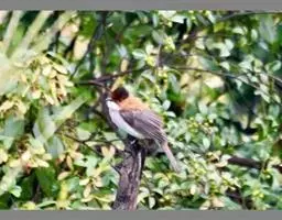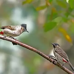 黄臀鹎(学名:Pycnonotus xanthorrhous):外形大小与红耳鹎相似,体长17-21厘米。额至头顶黑色,无羽冠或微具短而不明的羽冠。下嘴基部两侧各有一小红斑,耳羽灰褐或棕褐色,上体土褐色或褐色。颏、喉白色,其余下体近白色,胸具灰褐色横带,尾下覆羽鲜黄色。