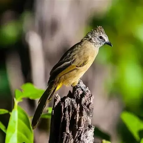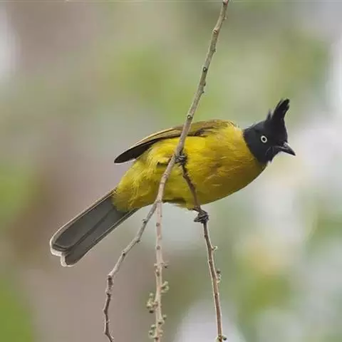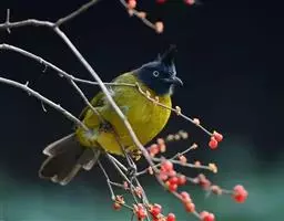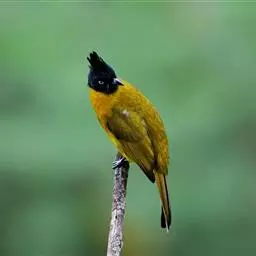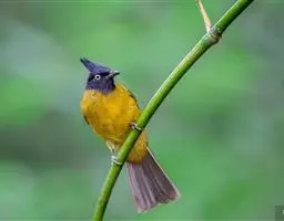 黑冠黄鹎:体长18-21厘米,是一种中等体型偏黄色鹎。整个头、颈、颏、喉黑色,头顶有显著直立的羽冠,…