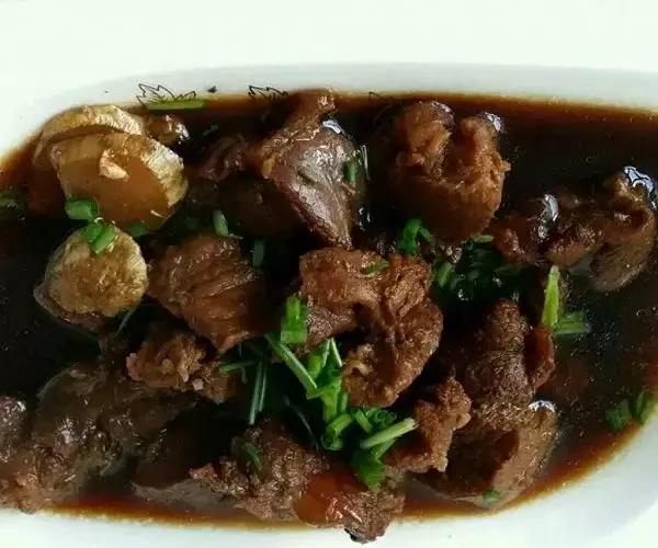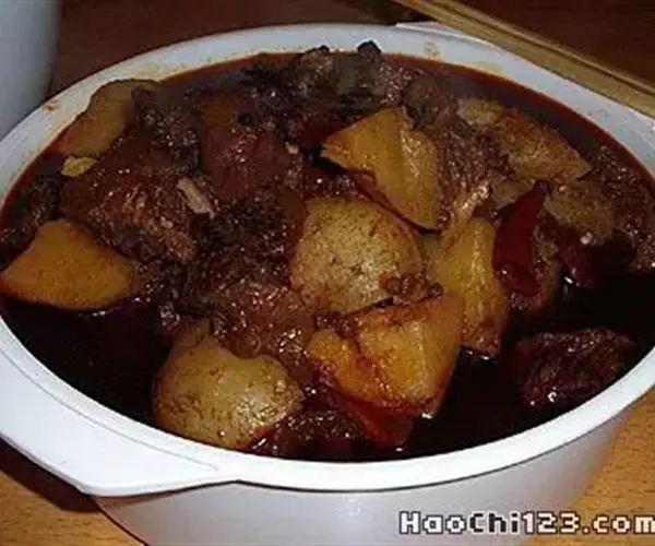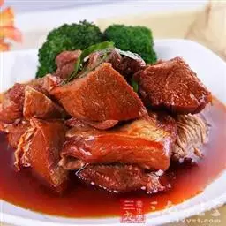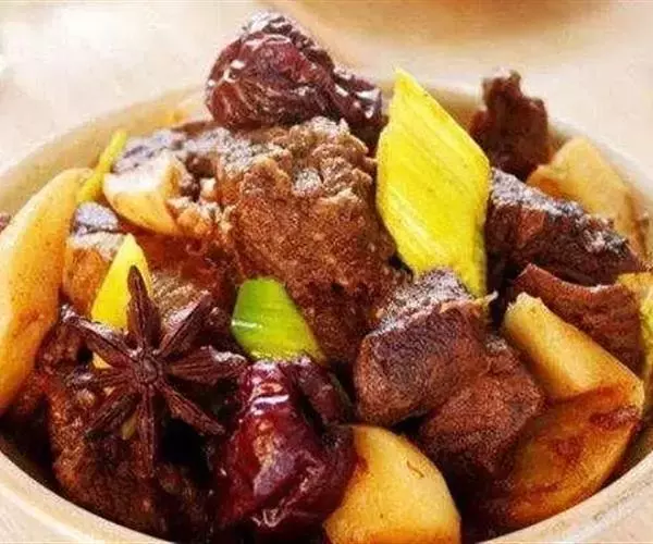2、油烧热 后将葱、姜爆香,再加入辣豆辨酱炒红,然后放入牛肉块翻炒并加入酱油、糖、胡椒粉、酒、味精及八角,最后加水浸过牛肉,用小火慢慢煮至汁稠、肉酥香即可。