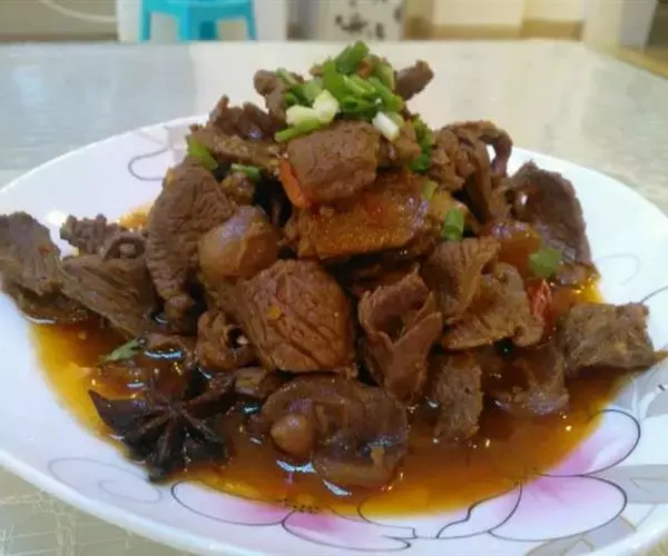 牛肉500克,味精2克,胡椒粉、八角、大葱各5克,葱、酒、酱油各25克,辣豆瓣酱20克,糖15克。