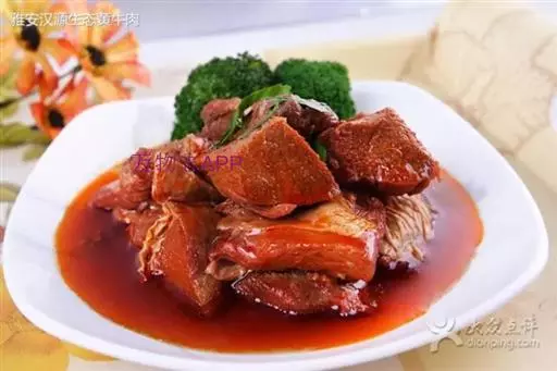 红烧牛肉 牛肉75克, 豆瓣酱10克,白萝卜30克,花椒1?5克,盐2克,花 生油10克,白糖、八角各适量。