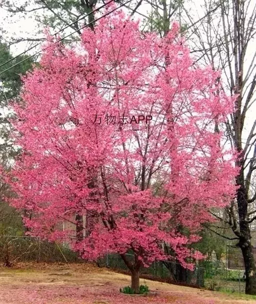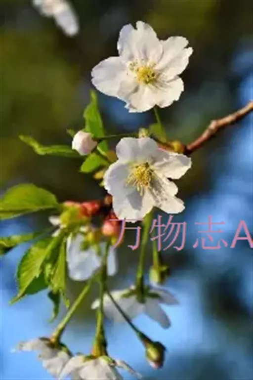 山樱花(学名:Cerasus serrulata (Lindl.) G. Don ex London):乔木,高3-8米,树皮灰褐色或灰黑色。小枝灰白色或淡褐色,无毛。冬芽卵圆形,无毛。叶片卵状椭圆形或倒卵椭圆形,上面深绿色,无毛,下面淡绿色,无毛。花序伞房总状或近伞形,有花2-3朵;总苞片褐红色,倒卵长圆形;花瓣白色,稀粉红色,倒卵形,先端下凹;雄蕊约38枚;花柱无毛。核果球形或卵球形,紫黑色。花期4-5月,果期6-7月。