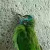 长20cm 嘴粗厚 ,黑色 ,脚铅灰色 。头部大致为蓝色 ,额 、喉黄色 ,眉斑杂有黑色羽毛 ,眼先有红色斑点 ,前颈亦有红斑 。后颈 、背部鲜绿色 , 胸以下鲜黄绿色 。