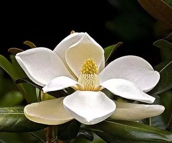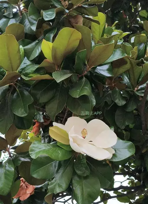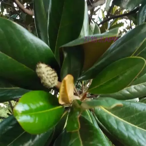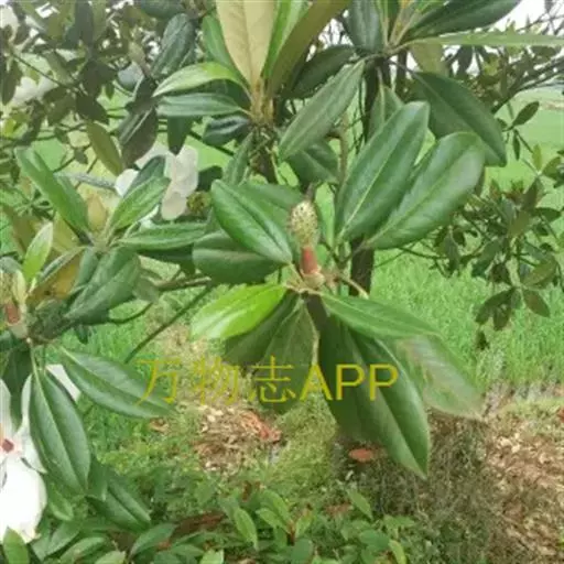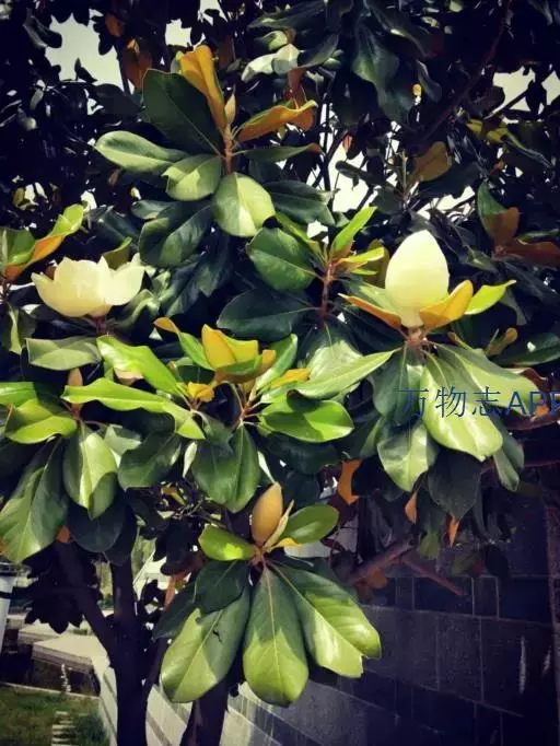 荷花玉兰(学名:Magnolia grandiflora L):常绿乔木,在原产地高达30米;树皮淡褐色或灰色,薄鳞片状开裂;小枝粗壮。叶厚革质,椭圆形,长圆状椭圆形或倒卵状椭圆形,叶面深绿色,有光泽。花白色,有芳香,直径15-20厘米;花被片9-12,厚肉质,倒卵形,长6-10厘米,宽5-7厘米。聚合果圆柱状长圆形或卵圆形,蓇葖背裂,背面圆,顶端外侧具长喙;种子近卵圆形或卵形,长约14毫米,径约6毫米,外种皮红色,除去外种皮的种子,顶端延长成短颈。花期5-6月,果期9-10月。