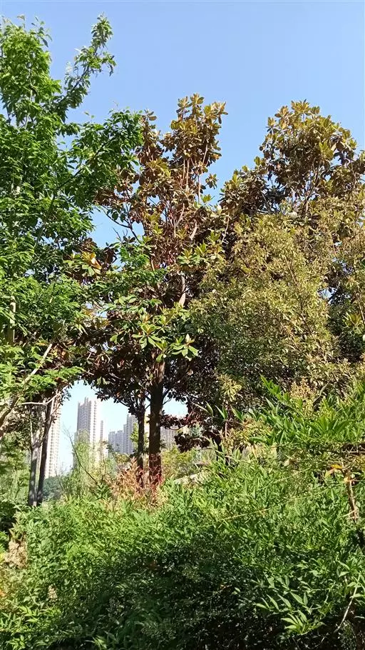 荷花玉兰大树移栽后应用草绳裹干2米左右以减少水分蒸发,干旱时可向草绳喷水营造一个湿润的小环境。栽植后应设支撑木固定树干,以防晃动,损伤根系。一般打桩不能起到固定作用,可选用长3米至4米的毛竹或其他材料制成的三脚架固定。如果移植后天气干旱,可向树冠喷雾或架高空喷雾,以降低叶片温度。