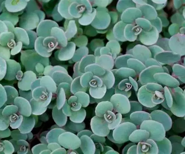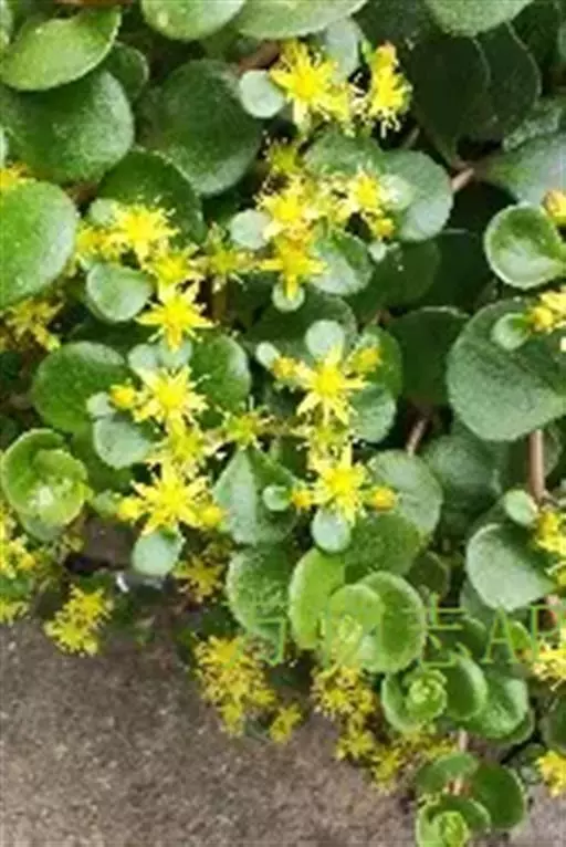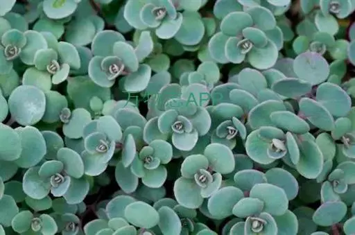 圆叶景天(Sedum sieboldii),景天科常绿多年生肉质草本植物,匍匐型生长,叶片对生,尖端钝圆,全光照条件下,叶片秋季变红,花瓣黄色或白色,花期4至6月。喜向阳和偏干环境,只要栽培在向阳、偏干的地方,就能茂盛生长;抗寒性强,病虫害较少。