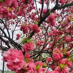 属于观赏桃花类的半重瓣及重瓣品种,统称为碧桃。华东地区碧桃花期是3月~4月,花朵丰腴,色彩鲜艳丰富,花型多。常见的品种有红花绿叶碧桃、红花红叶碧桃,白红双色洒金碧桃等多个变种。碧桃具有很高的观赏价值,在小区、公园、街道随处可见的美丽植物。