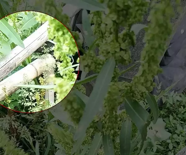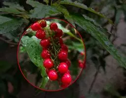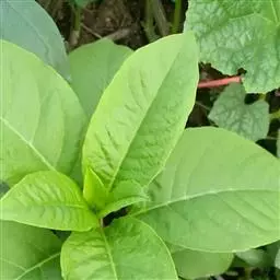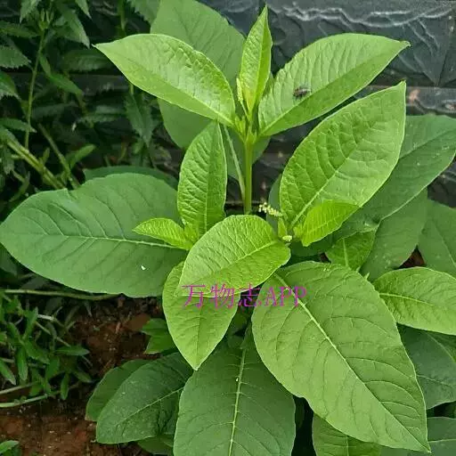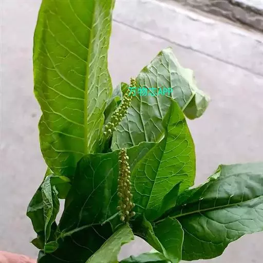 2、垂序商陆:多年生草本,高1~2米。根粗壮,肥大,倒圆锥形。茎直立,圆柱形,有时带紫红色。叶片椭圆状卵形或卵状披针形,长9~18厘米,宽5~10厘米,顶端急尖,基部楔形;叶柄长1-4厘米。