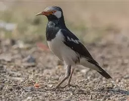 斑椋鸟:是中等体型的黑白色椋鸟,体长24厘米。头顶、头侧、翼斑、腰及腹部白色,喉、胸及上体余部黑色,…