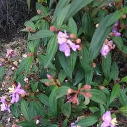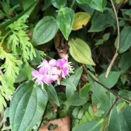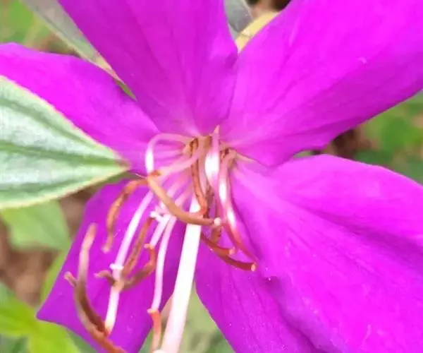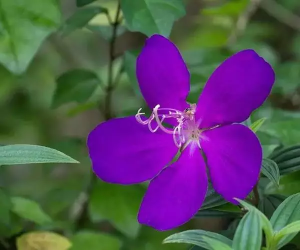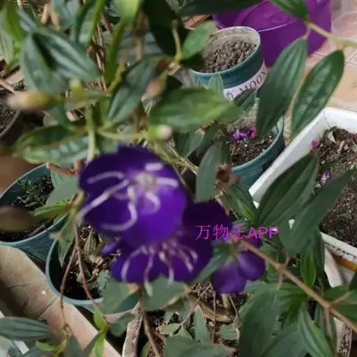 巴西野牡丹,常绿灌木,高0.6-1.5 米。茎四菱形,分枝多,枝条红褐色,株形紧凑美观;茎、枝几乎无毛。叶革质,披针状卵形,顶端渐尖,基部楔形,长3-7厘米,宽1.5-3厘米,全缘,叶表面光滑,无毛,5 基出脉,背面被细柔毛,基出脉隆起。