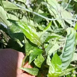 药材性状:全体皱缩成团,呈紫绿色至紫红色。茎下部圆柱形,嫩茎具棱,茎下部节上有不定根。叶对生,多皱缩,破碎;完整者展平后呈椭圆形或圆形,先端急尖,基部广楔形,全缘;叶柄长1-3cm。聚伞花序着生于茎梢。气微,味淡。