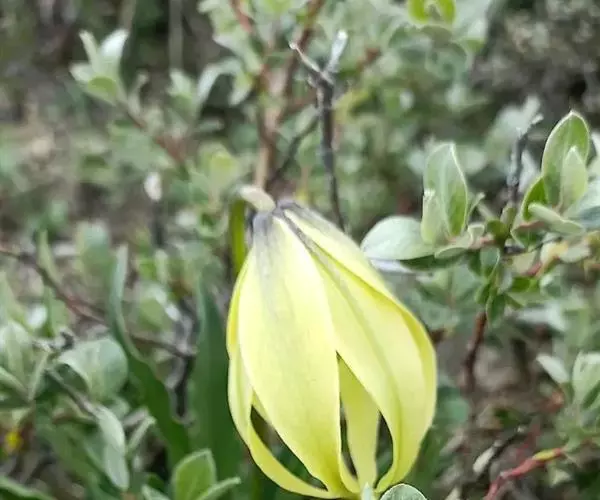 花通常1朵,少有2-3朵,下垂;花梗长9-15厘米;苞片叶状,披针形,长5-13厘米,宽3-10毫米;花黄色,淡黄色或淡黄绿色,具极稀疏的紫红色斑点或无斑点;花被片披针形或狭卵状披针形,长4.5-5.7厘米,宽0.9-1.6厘米,先端长渐尖,内轮花被片蜜腺两边具流苏状突起;雄蕊向中心靠拢,长1.5-2厘米;花丝钻状,无毛,花药椭圆形,长0.7-1厘米;子房圆柱形,长1-1.2厘米,宽3-4毫米;花柱长约1厘米,柱头膨大,头状。