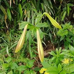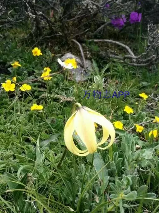 尖被百合(学名:Lilium lophophorum (Bur. et Franch.) Franch.):鳞茎近卵形,高4-4.5厘米,直径1.5-3.5厘米;鳞片较松散,披针形,白色,鳞茎上方的茎上无根。叶变化很大,由聚生至散生,披针形、矩圆状披针形或长披针形,3-5条脉。花通常1朵,少有2-3朵,下垂;花黄色,淡黄色或淡黄绿色,具极稀疏的紫红色斑点或无斑点;花被片披针形或狭卵状披针形,长4.5-5.7厘米,宽0.9-1.6厘米,先端长渐尖,内轮花被片蜜腺两边具流苏状突起。蒴果矩圆形,成熟时带紫色。花期6-7月,果期8-9月。