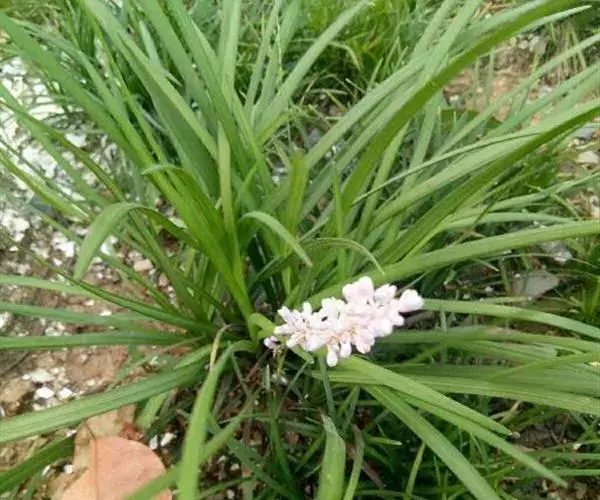 沿阶草(学名:Ophiopogon bodinieri Levl.)百合科草本。根纤细,近末端处有时具小块根;地下走茎长,节上具膜质的鞘。茎很短。叶基生成丛,禾叶状,先端渐尖,边缘具细锯齿。花葶较叶稍短或几等长,总状花序长1-7厘米,具几朵至十几朵花;花常单生或2朵簇生于苞片腋内;苞片条形或披针形,稍带黄色,半透明,花梗长5-8毫米,关节位于中部;花被片卵状披针形、披针形或近矩圆形,白色或稍带紫色;花丝很短,花药狭披针形,常呈绿黄色;花柱细。种子近球形或椭圆形。花期6-8月,果期 8-10月。