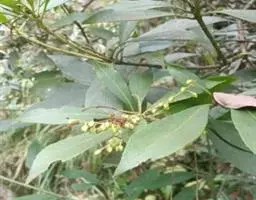叶革质,密集枝顶,椭圆状披针形,长3-8厘米,宽1-2厘米,先端短渐尖,基部狭楔形,边缘在2/3以上具细圆齿,稀近于全缘,无毛,表面深绿色,背面淡绿色,主脉在两面凸起,侧脉在表面下陷,在背面不明显,小脉网状;叶柄长3-8毫米,腹面有深沟,背面圆形,微被柔毛。