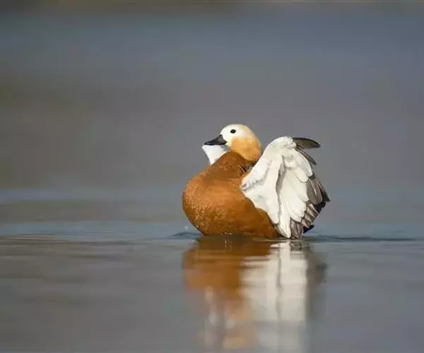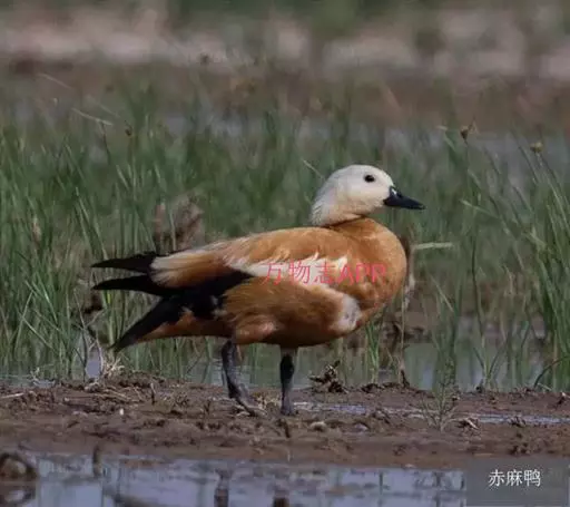 赤麻鸭(学名:Tadorna ferruginea)体型较大,体长51-68厘米,体重约1.5千克,比家鸭稍大。全身赤黄褐色,翅上有明显的白色翅斑和铜绿色翼镜;嘴、脚、尾黑色;雄鸟有一黑色颈环。飞翔时黑色的飞羽、尾、嘴和脚、黄褐色的体羽和白色的翼上和翼下覆羽形成鲜明的对照。栖息于开阔草原、湖泊、农田等环境中,以各种谷物、昆虫、甲壳动物、蛙、虾、水生植物为食。繁殖期4-5月,在草原和荒漠水域附近洞穴中营巢,每窝产卵6-15枚,卵椭圆形,淡黄色,雌鸟负责孵卵。主要繁殖于欧洲东南部、地中海沿岸、非洲西北部、亚洲中部和东部,越冬在日本、朝鲜半岛、中南半岛、印度、缅甸、泰国和非洲尼罗河流域等地。