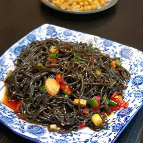 将白豌豆用井水浸泡,磨制成浆,用祖传工艺加工成凉粉状,切丝装盘。