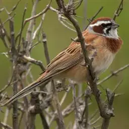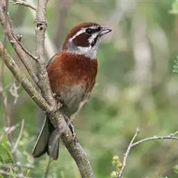 栗斑腹鹀:属小型鸣禽。体重19-25克,体长145-167毫米。头顶至背栗红色,眼先和颧纹黑褐色,…
