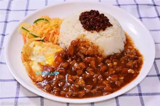 特别提醒:蒸饭时,水和米的比例是1:1;饭蒸好后,不要急着盛出来,放在电饭煲内保温,卤肉做好后再盛饭浇肉汁,即取即吃。