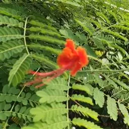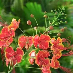洋金凤 Sw.),豆科小凤花属灌木状或小乔木植物,枝无毛,绿或粉绿色;二回羽状复叶;总状花序伞房状,…