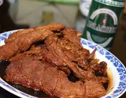 牛肉一斤,五香桂皮少许,姜三片葱一棵酱油、酒糖适量
