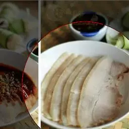 蘸汁料:麻油、生抽、红椒丝各1汤匙,浙醋1汤匙半,熟油1茶匙,红椒丝1汤匙,糖半茶匙。