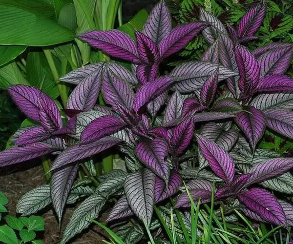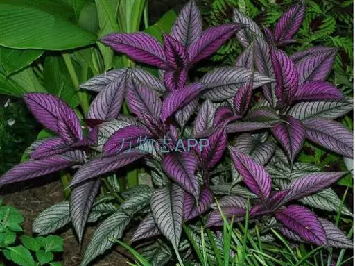 盆栽时株高可达30厘米左右,叶在绿色衬底上有紫、粉红、红、淡黄、橙等彩色斑纹,有时也有杂色的品种,叶卵形或圆形。其8—9月开花,花型小,淡蓝或白色,自枝顶抽出,无观赏价值,主要用于观叶。