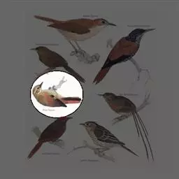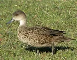 雌鸟上体暗褐而沾橄榄色,眼前上方和眼先处各有一白色斑,耳后方有一白色圆斑;两翅及尾羽暗褐色,下体污白色,具淡褐色羽缘,形成斑杂状;两肋、腋羽及尾下覆羽均淡褐色。