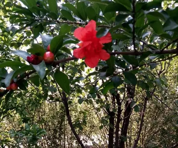 盛开的石榴花 石榴花常用扦插、分株和压条繁殖。扦插,春季选二年生枝条或夏季采用半木质化枝条扦 插均可,插后15~20天生根。分株,可在早春4月芽萌动时,挖取健壮根蘖苗分栽。