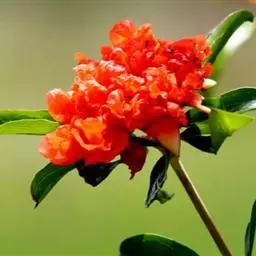 橙色石榴花 石榴为石榴科落叶灌木或小乔木,高2~5米,原生长于亚洲西部地区,经汉代张骞带入中国。经过历代培植,品种渐多。陕西临潼的石榴,鲜红硕大,皮薄汁多,甘多于酸,为中国石榴之冠。
