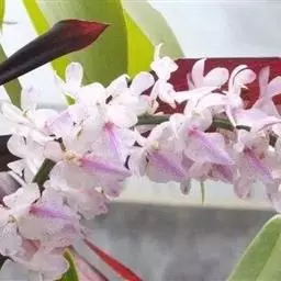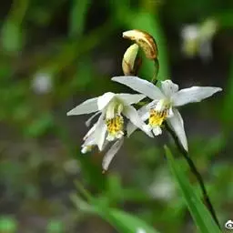 指甲兰是兰科指甲兰属植物。其茎粗壮;叶带状;总状花序疏生数朵花;萼片和花瓣淡白色,…