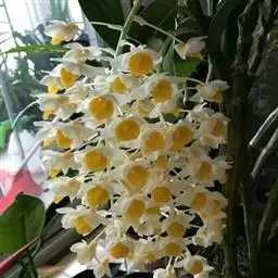 黄石斛:茎直立或下垂,多少肉质,细圆柱形,不分枝,具多数节。叶革质,长圆状披针形,…