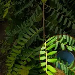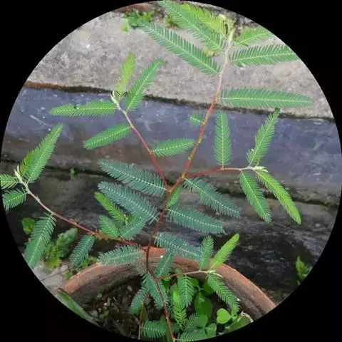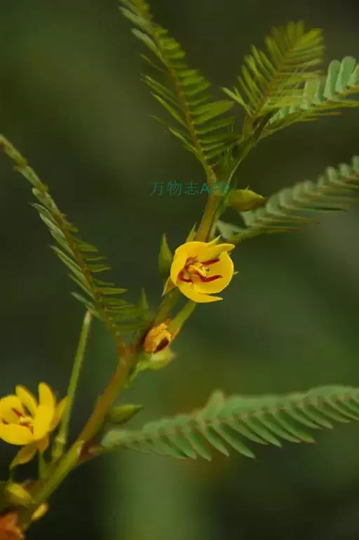 叶长4-8厘米,在叶柄的上端、最下一对小叶的下方有圆盘状腺体1枚;小叶20-50对,线状镰形,长3-4毫米,宽约1毫米,顶端短急尖,两侧不对称,中脉靠近叶的上缘,干时呈红褐色;托叶线状锥形,长4-7毫米,有明显肋条,宿存。