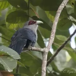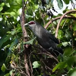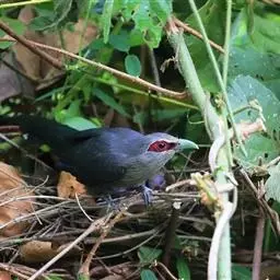 绿嘴地鹃:体形似小鸦鹃,但羽色大致绿灰;嘴绿色,头侧眼的周围有一裸区;后爪弯曲。虹膜赤红色,…