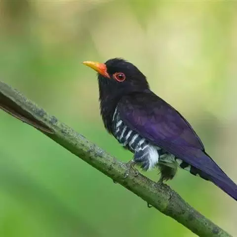 紫金鹃是一种羽色艳丽的小形杜鹃,体长约17厘米。雄鸟头、颈、胸和上体辉紫色,腹白色,…