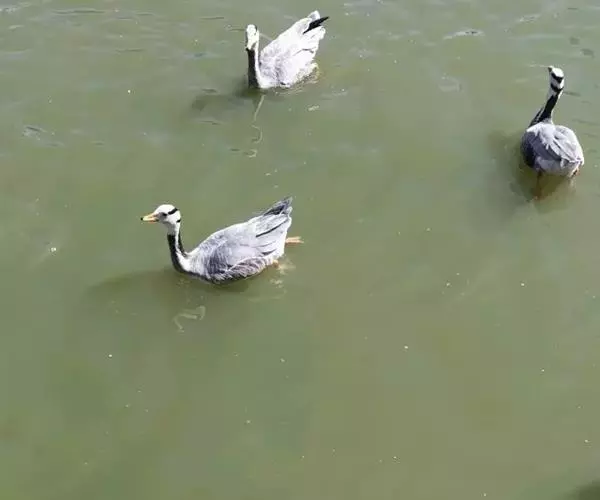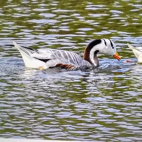 斑头雁(学名:Anser indicus)是中型雁类,体长62-85厘米,体重2-3千克。通体大都灰褐色,头和颈侧白色,头顶有二道黑色带斑,在白色头上极为醒目,繁殖在高原湖泊,尤喜咸水湖,也选择淡水湖和开阔而多沼泽地带。越冬在低地湖泊、河流和沼泽地。 性喜集群,繁殖期、越冬期和迁徙季节,均成群活动。主要以禾本科和莎草科植物的叶、茎、青草和豆科植物种子等植物性食物为食,也吃贝类、软体动物和其他小型无脊椎动物。分布于中亚、克什米尔及蒙古国,越冬在印度、巴基斯坦、缅甸和中国云南等地。