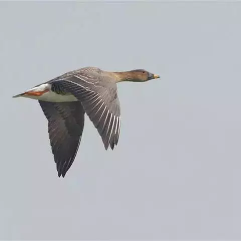 豆雁,雁形目鸭科。成鸟头、颈、背灰褐色,带淡黄色羽缘;尾上覆羽白色,尾羽黑褐色带白端,…