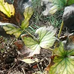 真菌病害,由葡萄孢菌引起的灰霉病症状:秋海棠叶片灰霉病经常发植株的下部,尤其是根茎处与基质接触的地方更容易感染病菌,被水浸润的病斑很快会扩散到整个叶整个植株,受害区域呈现坏死斑点,逐渐由褐色转变为黑色。当夜间温度较低、白天温度较高而且湿高时,病原孢子生长加快,受害的叶片上会长出灰绿色的霉状物。