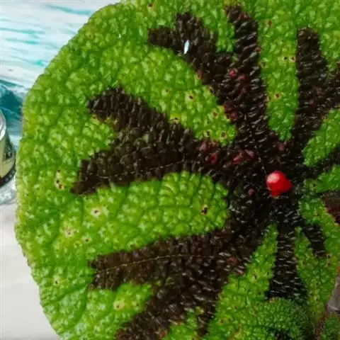 由漆斑菌引起的秋海棠叶斑病症状:病症一般出现在秋海棠叶片边缘、叶尖和破损叶片的叶脉上。坏死区域呈现黑褐色,然后是水渍状。诊断方法是下部的叶片经常会不规则形状的孢子群,中央呈黑色,但边缘为白色。