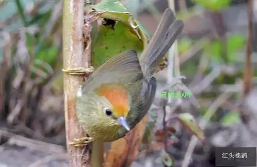 红头穗鹛(学名:Stachyris ruficeps),小型鸟类,体长10-12cm。头顶棕红色,上体淡橄榄褐色沾绿色。下体颏、喉、胸浅灰黄色,颏、喉具细的黑色羽干纹,体侧淡橄榄褐色。主要以昆虫为食,偶尔也吃少量植物果实与种子。常单独或成对活动,有时也见成小群或与棕颈钩嘴鹛或其他鸟类混群活动,在林下或林缘灌林丛枝叶间飞来飞去或跳上跳下。通常营巢于茂密的灌丛、竹丛、草丛和堆放的柴捆上。