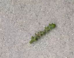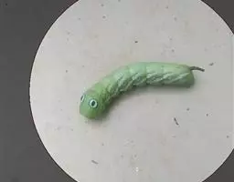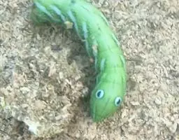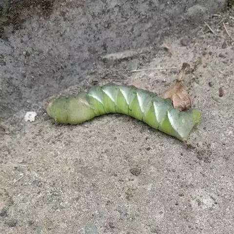 体长80mm,黄绿至绿色,体表密生黄白色颗粒。胸部侧面有一条、腹侧有7条黄色斜纹,自各节前缘下侧向上方斜伸,止于下l体节背侧近后缘,第7腹节者止于 尾角。尾角粗长,生于第8腹节背面。气门椭圆形,围气门片黑色。
