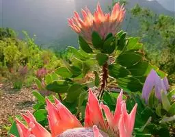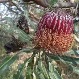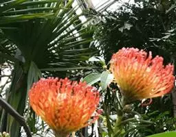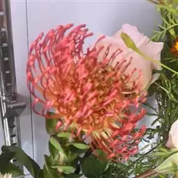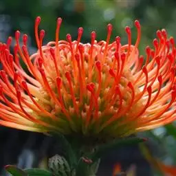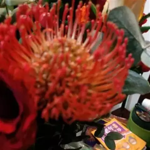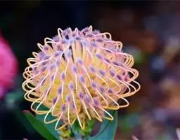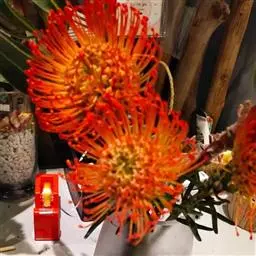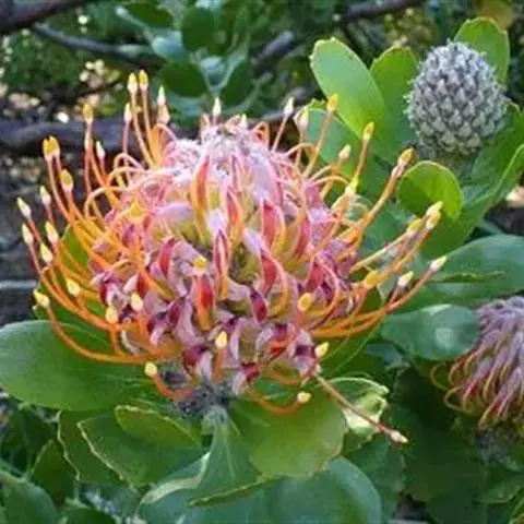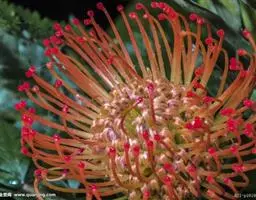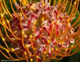 帝王花,山龙眼科帝王花属多年生常绿灌木植;茎干粗壮,叶色翠绿光亮;花朵呈圆球状;其苞片有的完全打开,…
