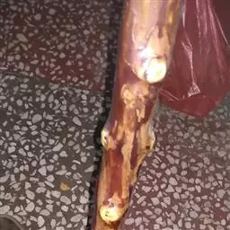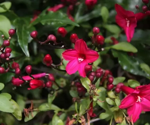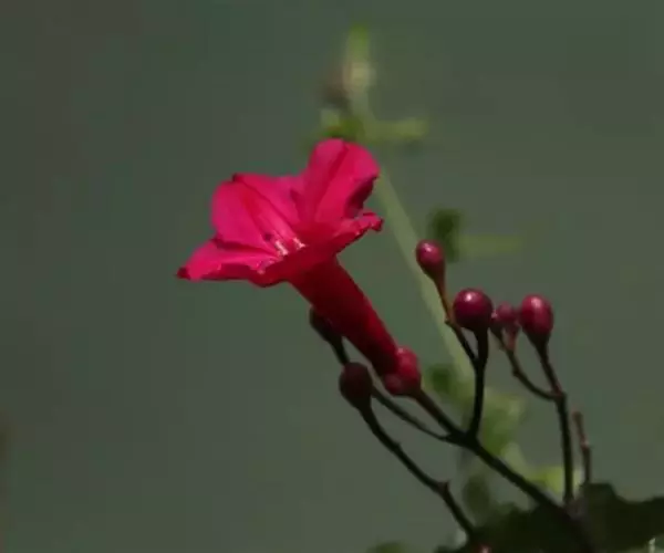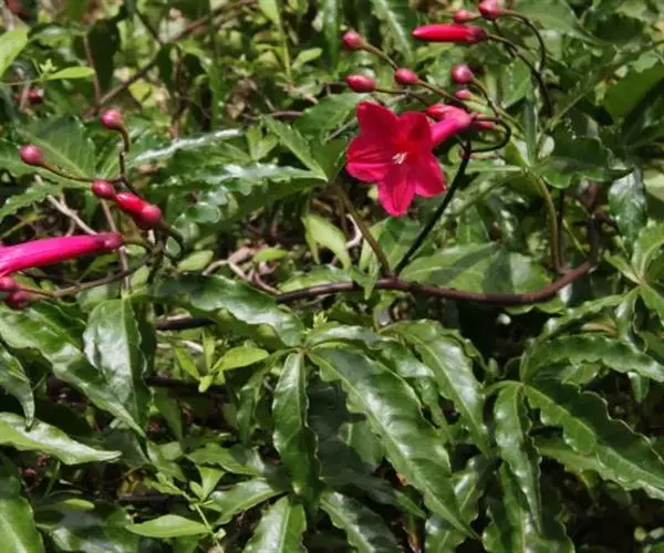多年生常绿蔓性藤本,深褐色。叶互生,掌状深裂,小叶3~5片,长椭圆形至披针形,革质,具花泽。花腋生,花冠喇叭状,先端五裂,红色。