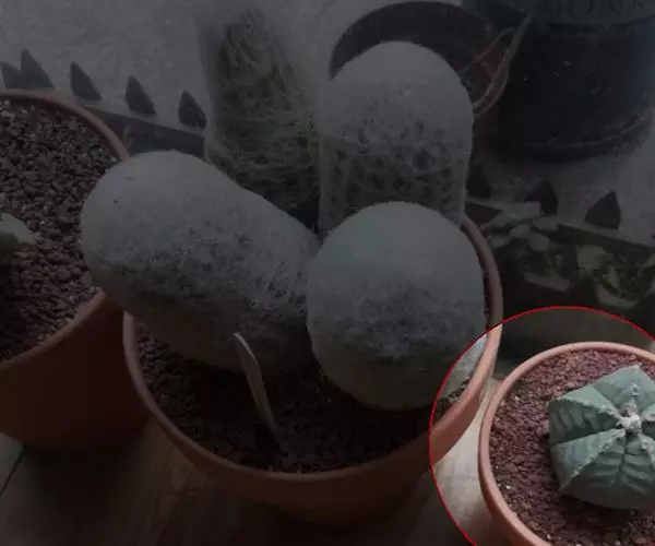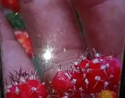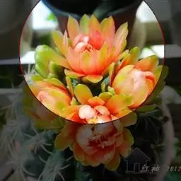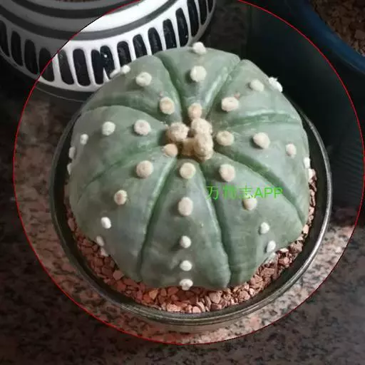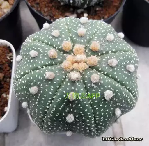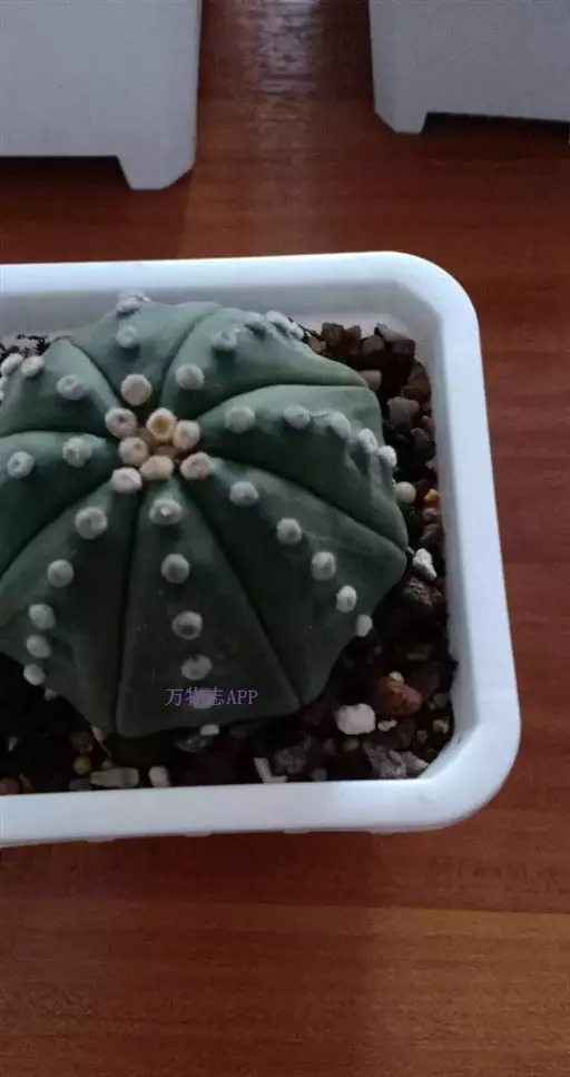 植株呈扁圆球形,直径5~8cm,球体由6~10条浅沟而分成6~10个扁圆棱。无刺,刺座上有白色星状 星兜、兜 绵毛。花着生于球顶部,漏斗形,黄色,花心红色,直径3~4cm。