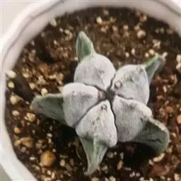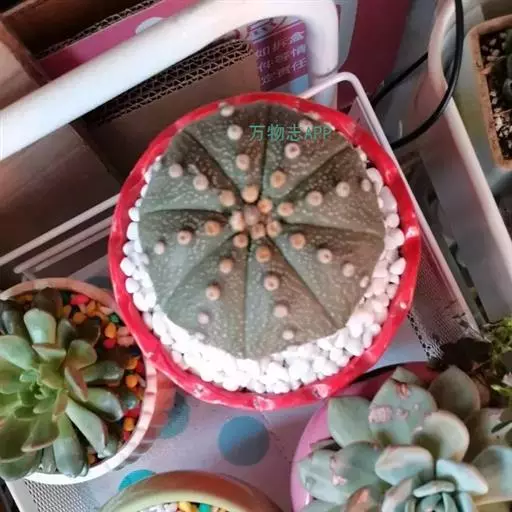 星兜,其拉丁学名为Astrophytum asterias。原产美国南部、墨西哥北部、东北和中部地区。植株呈扁圆球形,直径5~8cm,球体由6~10条浅沟而分成6~10个扁圆棱。无刺,刺座上有白色星状绵毛。花着生于球顶部,漏斗形,黄色或红色,花心红色。