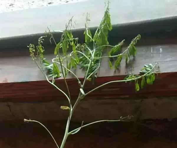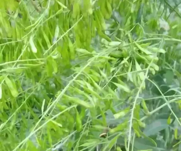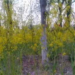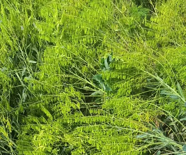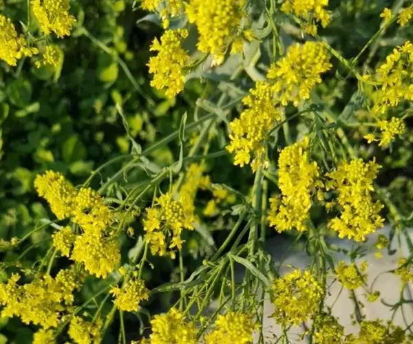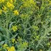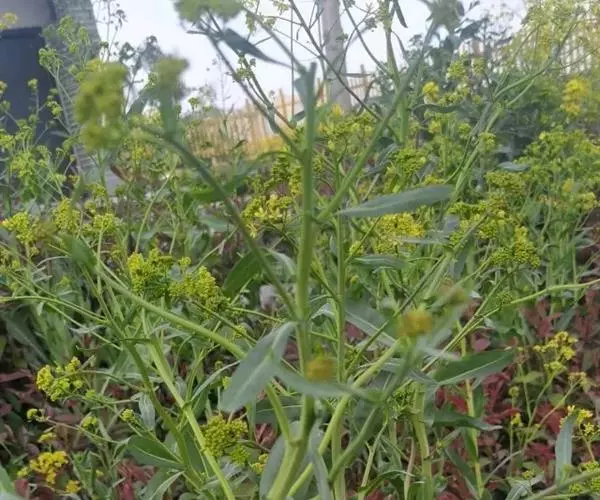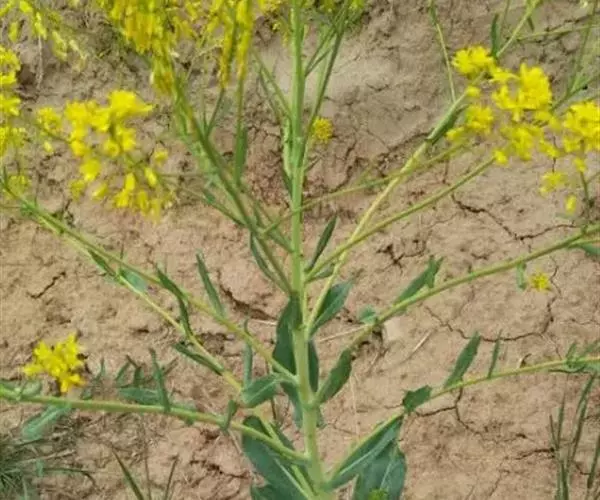 欧洲菘蓝 二年生草本,高30-80厘米。主根粗,径5-10毫米,灰黄色。茎直立,上部多分枝,无毛,稍有粉霜。基生叶有长柄,叶片长圆状椭圆形,基部渐狭,先端稍尖,通常全缘或略具波状齿;茎生叶无柄,披针形或长圆形,长3-6厘米,宽1-2厘米,基部箭形,抱茎,先端钝,全缘;茎上部叶线形。总状花序呈圆锥状;花黄色,直径7-10毫米;花梗纤细,下垂;萼片长圆形,开展,长约3毫米;花瓣狭倒卵形,长5-6毫米,有短爪;雄蕊6,花丝扁平,无牙齿;蜜腺在短雄蕊基部者呈环状,一侧微缺,在每对长雄蕊基部外侧者呈半月状;子房1室。短角果不开裂,两侧压扁,有翅,无隔膜,长圆形,长13-17毫米,宽3.5-5毫米,基部楔形,先端钝或微缺,具不明显肋。种子长圆状椭圆形,长约3毫米,黄褐色;子叶背倚。花期5月,果期6月。